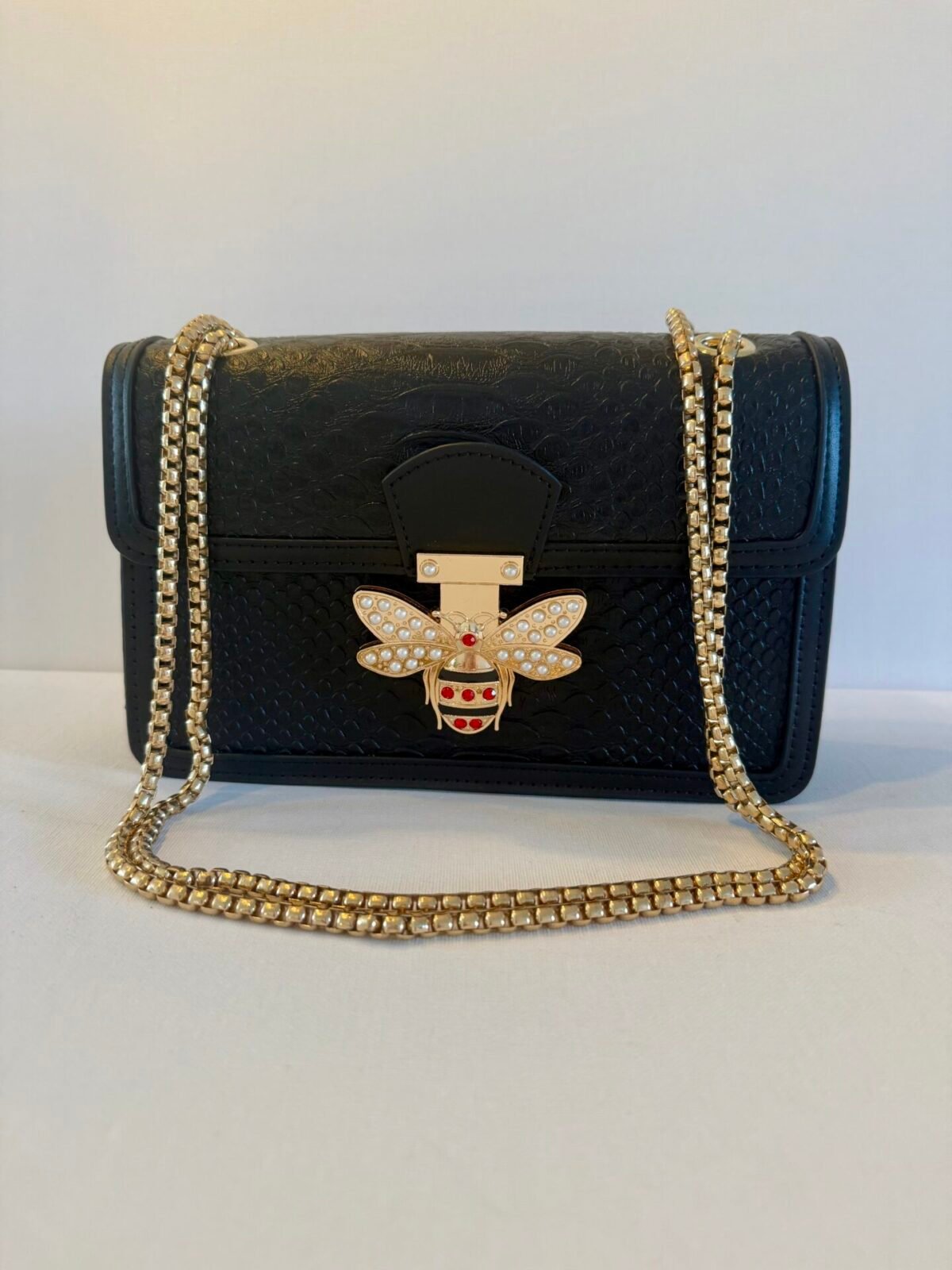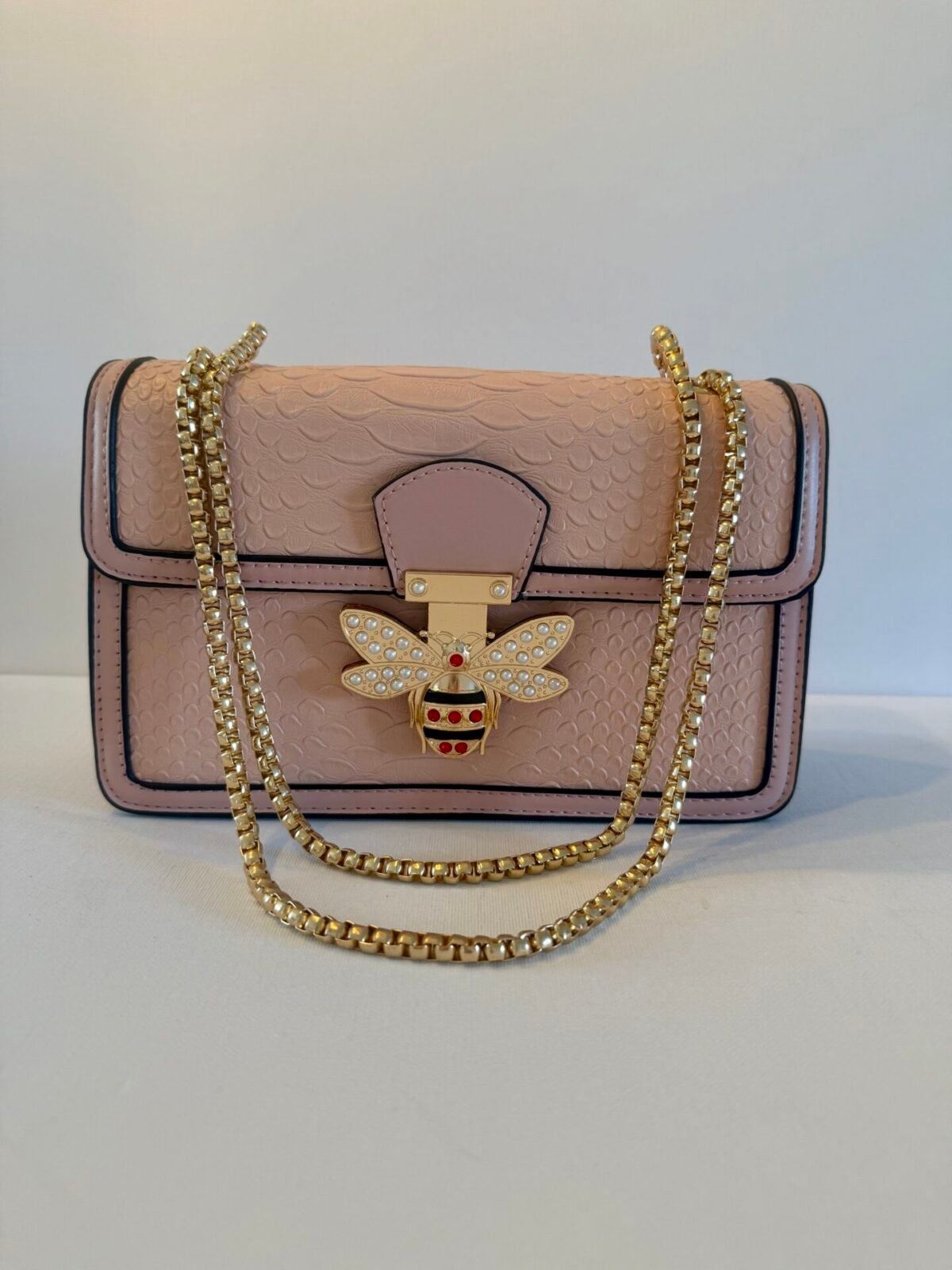Pink shoulder handbag with bee motif fastening.