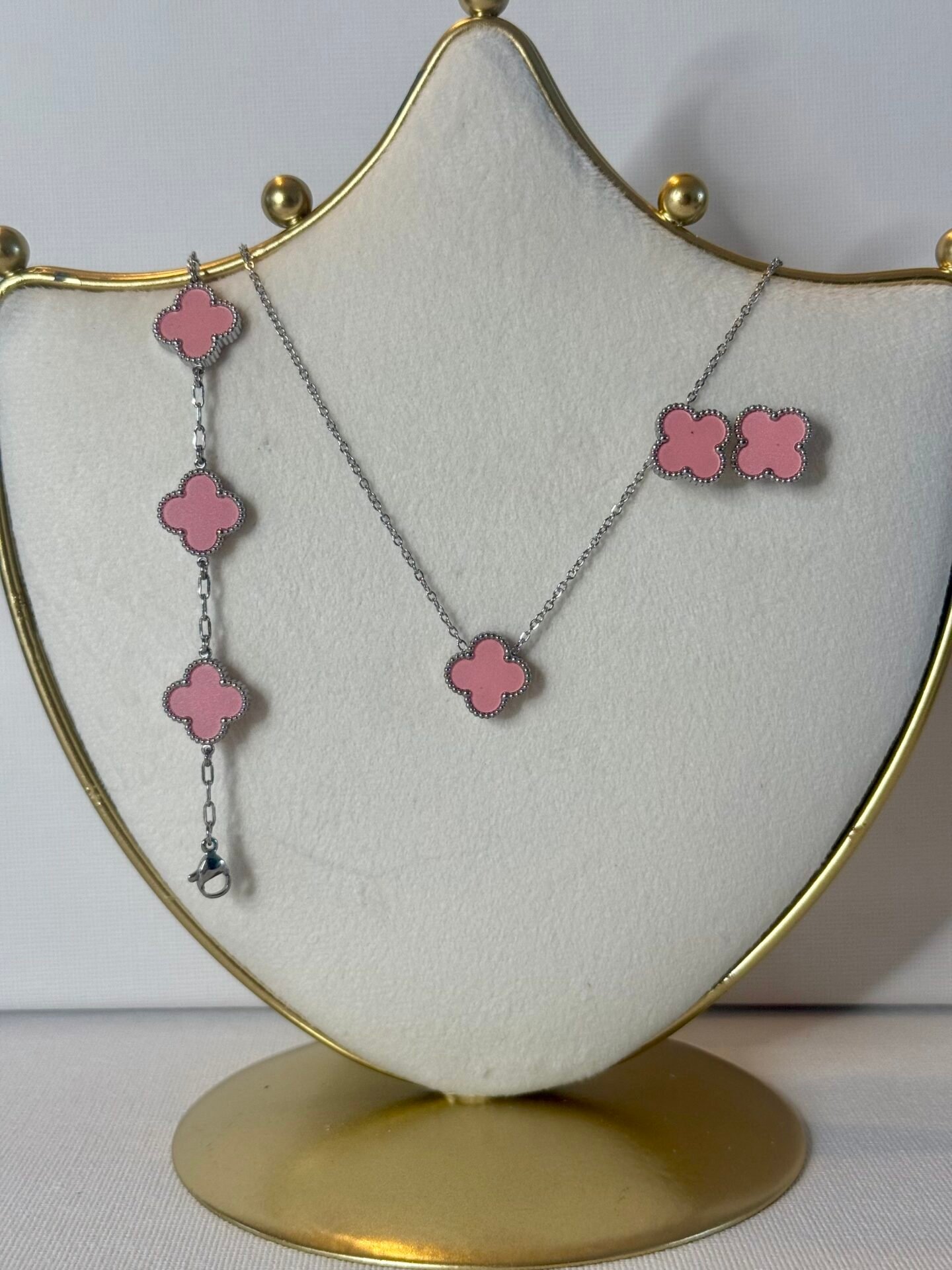 Silver plated clover pendant necklace with matching bracelet and earrings.